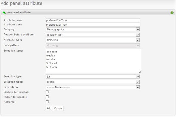A panel attribute is a simple question about a panelist. Examples are date of birth, phone number and job title. Panel attributes define what information panelists need to provide about themselves.