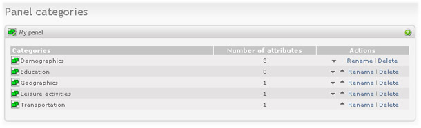 Move category. Click on the arrow up or arrow down icon in the Action column of the categories table. Note that all attributes in the category will be moved as well. Here you define the order of the categories, which means that in panelist profile form the categories will be displayed in the order they appear on this screen.